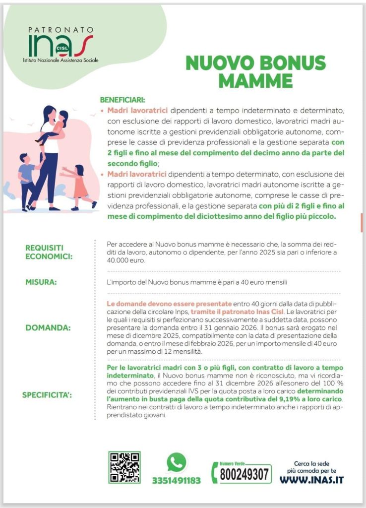 Il nuovo bonus mamme è un contributo mensile di 40 euro destinato alle lavoratrici con almeno due figli. La misura è prevista dal decreto-legge 95/2025 e l’Istituto di previdenza spiega che l’agevolazione “sostituisce temporaneamente l’esonero contributivo inizialmente programmato, posticipato al 2026”. L’importo è esentasse e non è rilevante ai fini del calcolo dell’Isee.