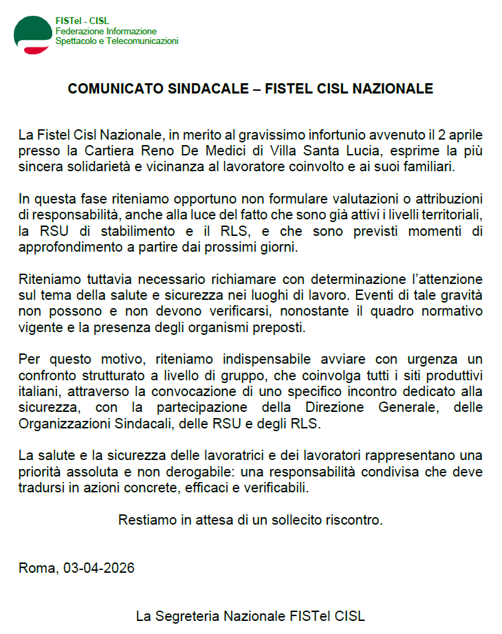 La Fistel Cisl Nazionale, in merito al gravissimo infortunio avvenuto il 2 aprile presso la Cartiera Reno De Medici di Villa Santa Lucia, esprime la più sincera solidarietà e vicinanza al lavoratore coinvolto e ai suoi familiari.
